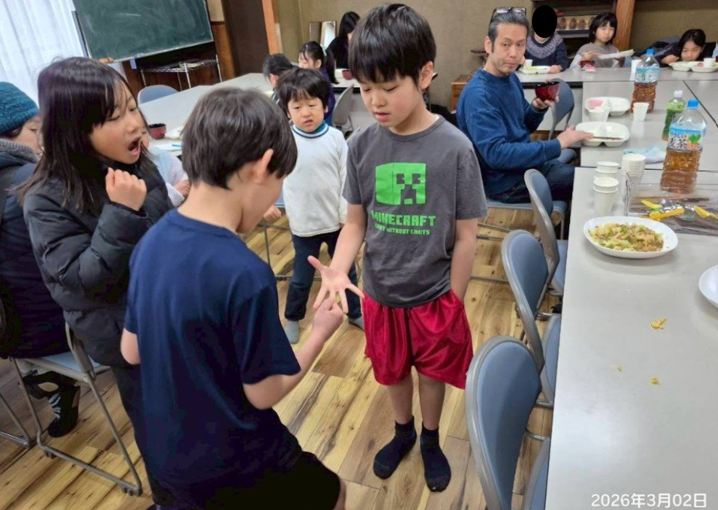 ごはんの後は、登校時間までじゃんけんしたりコマ回ししたりして賑やかに楽しい時間を過ごしました。